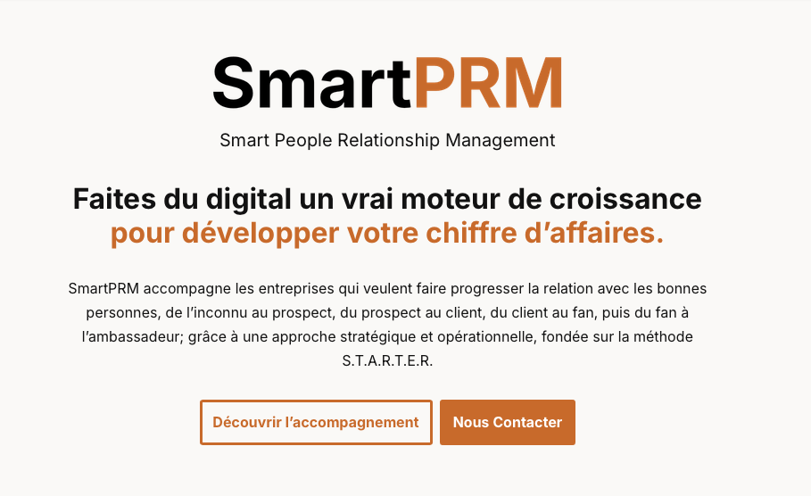 Accompagnement dédié au marketing, à la relation et à la croissance. Structuré autour de la méthode S.T.A.R.T.E.R.™, pour les entreprises qui veulent faire du digital un vrai levier de chiffre d’affaires.