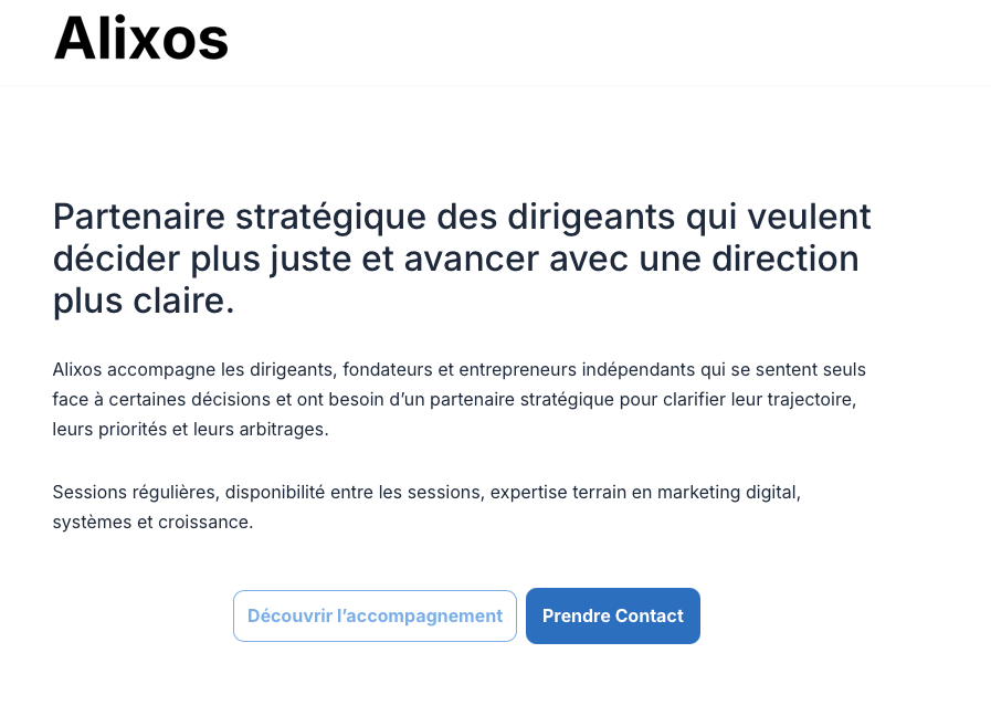 Partenaire stratégique des fondateurs et dirigeants. Sessions régulières, disponibilité entre les sessions, expertise en stratégie, organisation et marketing digital. Pour ceux qui veulent mieux décider et avancer avec une direction plus claire.
