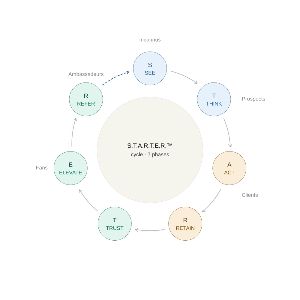 La méthode S.T.A.R.T.E.R.™ est un framework opérationnel en 7 phases et 5 types de personnes — de l’inconnu à l’ambassadeur. Un cycle de croissance complet pour structurer l’acquisition, la conversion, la fidélisation et la recommandation dans un business digital. La référence pour ceux qui veulent construire une croissance qui tient dans la durée.